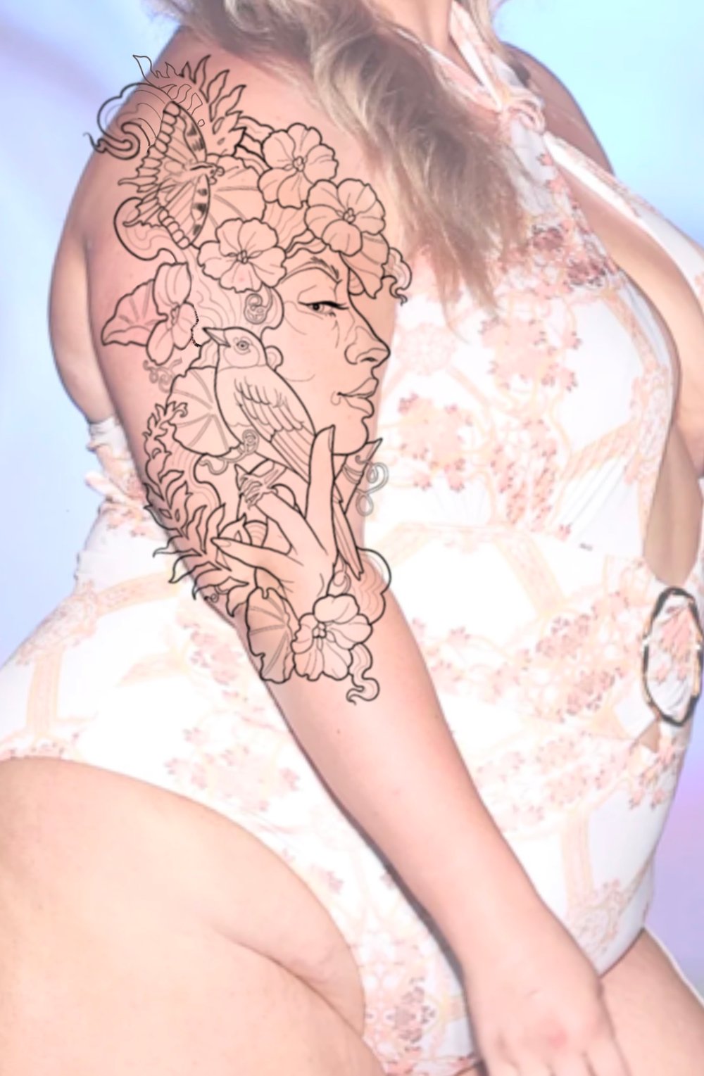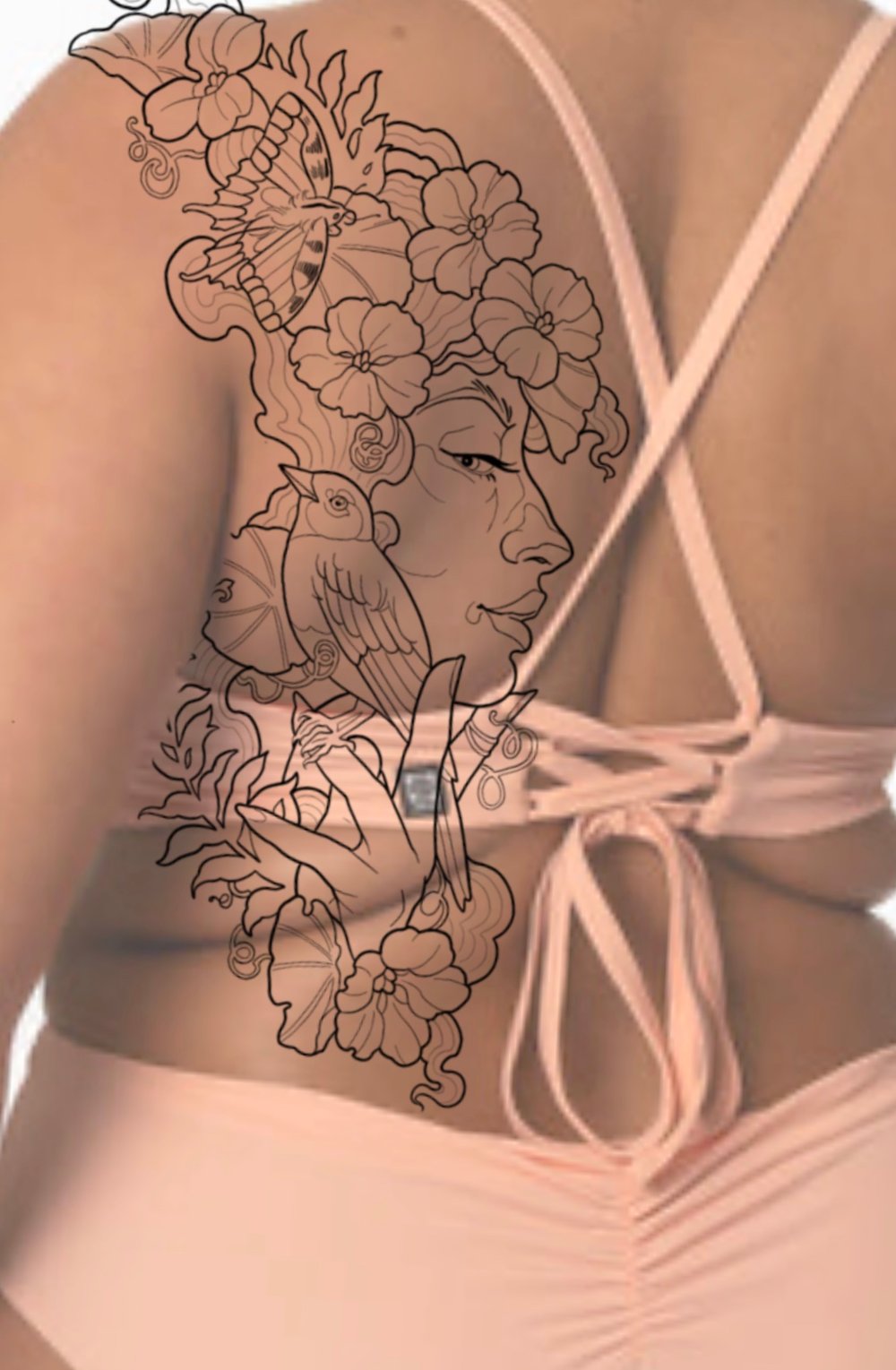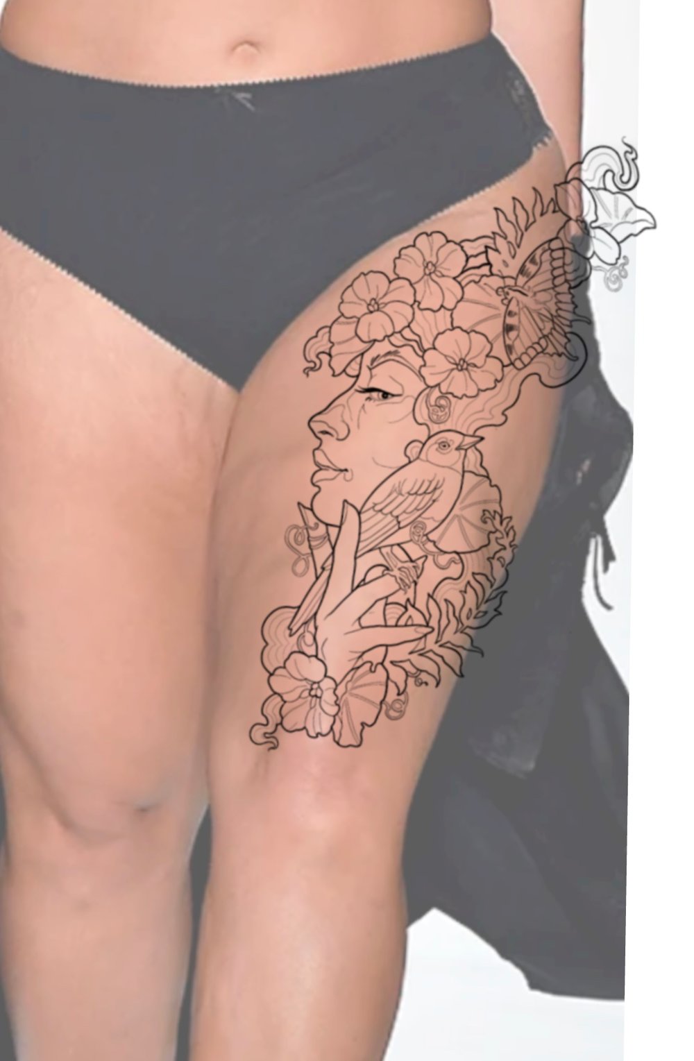 This piece has to be done at a large scale size to get all of the detail in. This means she would be perfect for a half sleeve, full thigh piece (front or side), full lower leg, and potentially some spaces on the torso.